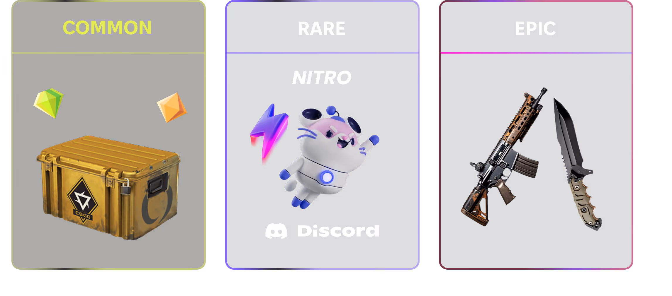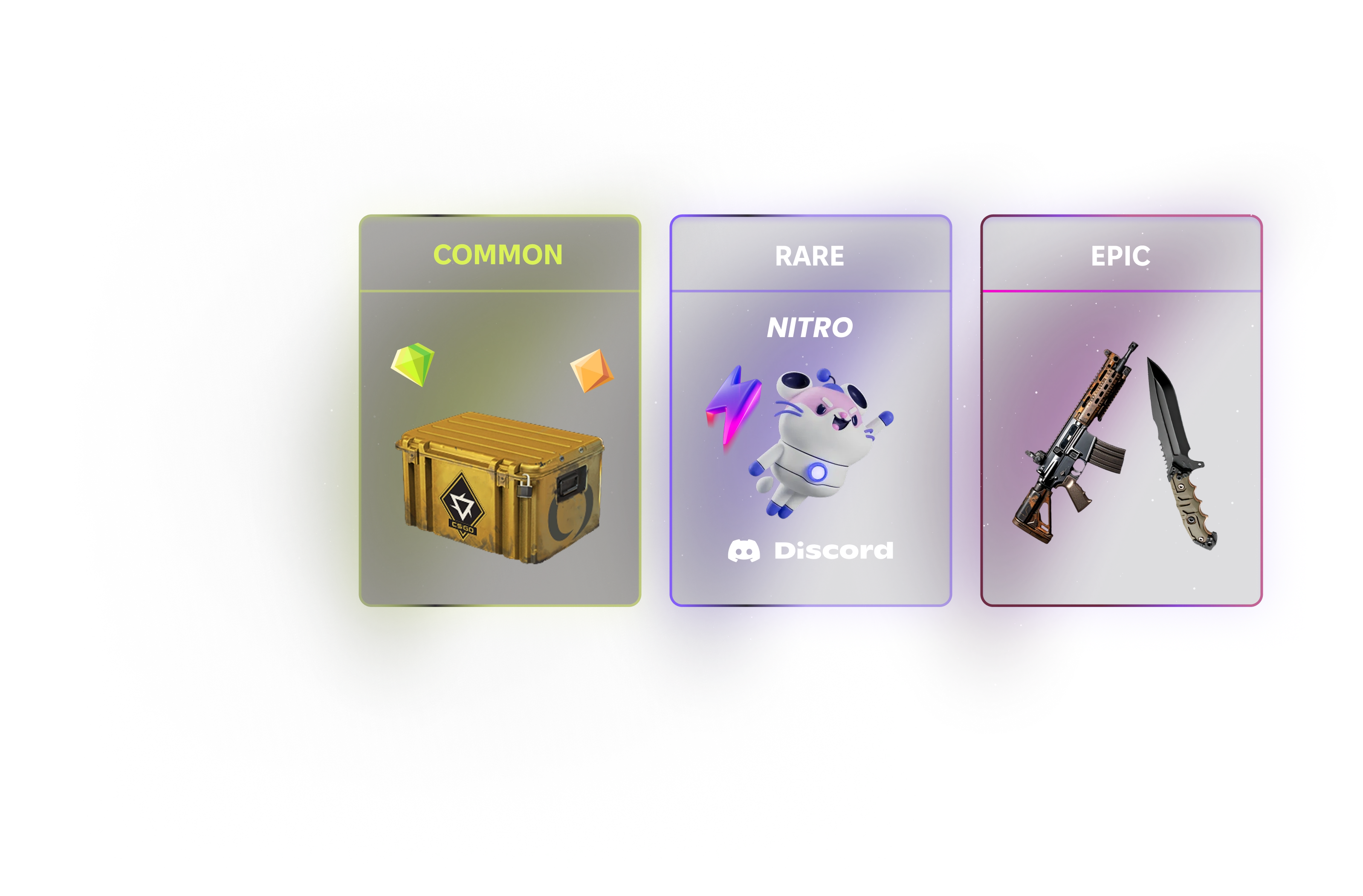 Hol dir regelmäßige Drops – mit der Chance auf ultra-seltene Rewards. Game Keys, Skins, Discord Nitro, Gamepässe, Ingame-Währung und exklusive Events warten auf dich.